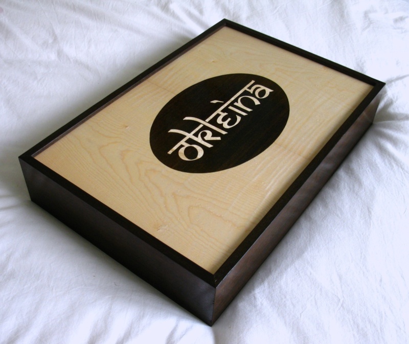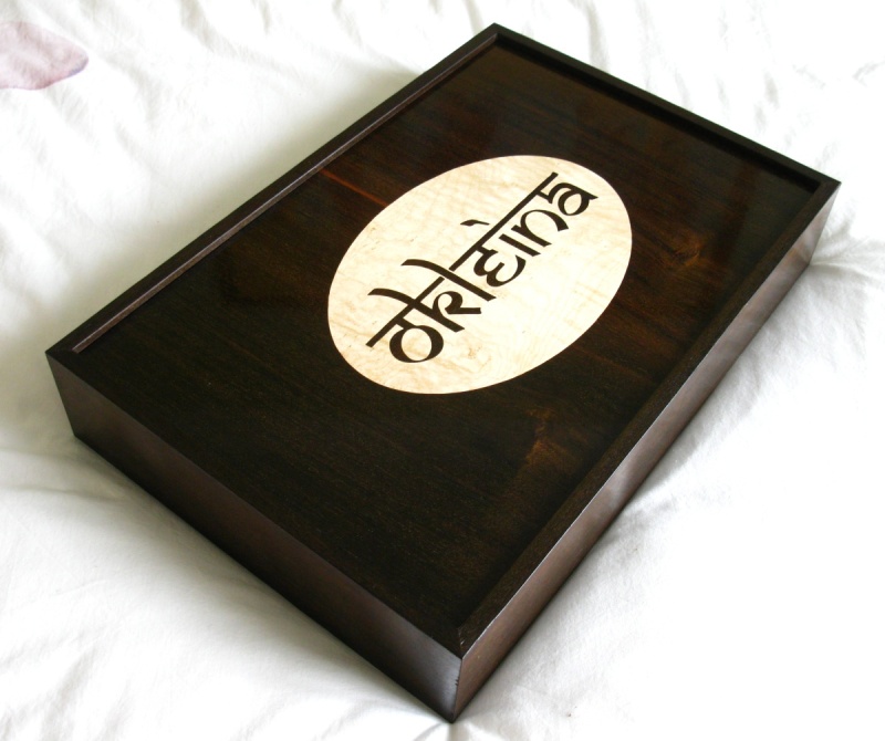 Dimensions: L:32 cm, l:16 cm, h:6 cm. Essences utilisées: noyer français, palissandre. Finition: vernis polyuréthane.